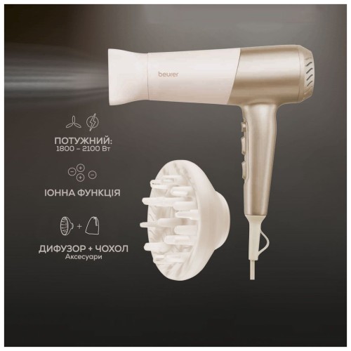 Однією з головних особливостей Beurer HC 70 є його генератор іонів, який усуває статичну електрику, робить волосся більш м'яким, блискучим і доглянутим, як після професійного салону. Додаткова функція подачі холодного повітря дозволяє фіксувати укладку, щоб вона зберігала форму і об'єм протягом цілого дня.