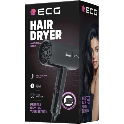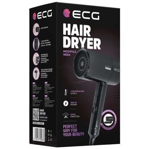 Рівень шуму складає 80 дБ, що сприяє комфортному використанню, а номінальна напруга роботи становить 220–240 В при частоті 50/60 Гц. Фен ECG Modifica Nera стане незамінним помічником як у домашньому використанні, так і під час подорожей.