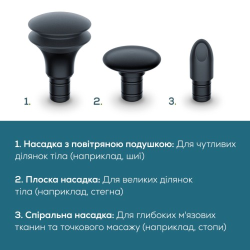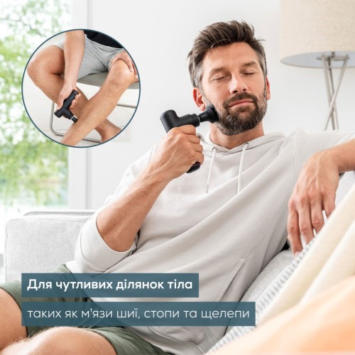 Масажер для м'язів оснащений різними видами масажу, включаючи масаж тригерних точок і масаж. Оптимально підходить для чутливих ділянок тіла, таких як шия, стопи та щелепні м'язи. Дуже компактний, але забезпечує чудову продуктивність. Він має 3 рівні інтенсивності на вибір, 3 насадки і може працювати до 3 годин на 1 зарядці.