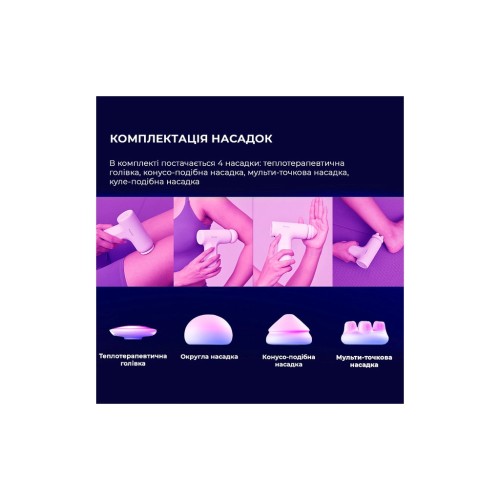 Оснащений 4 масажними головками, які забезпечують цілеспрямоване полегшення для кожної групи м'язів. На відміну від інших масажерів, які можуть похвалитися великою кількістю насадок, дизайн Yunmai mini 2 зосереджений на практичності – 4 голівки точно задовольнять усі ваші потреби.