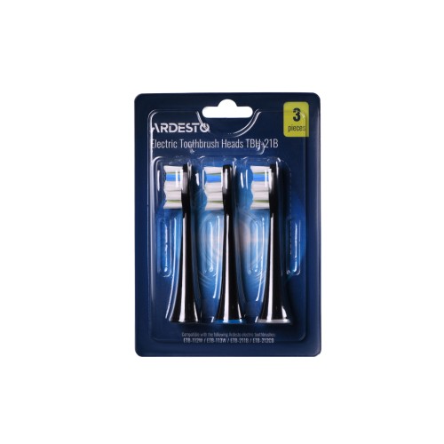 Насадка до електричних зубних щіток ARDESTO TBH-21B. У пакуванні – 3 шт. (із декоративними кільцями чорного, синього та сірого кольорів). Щетина DuPont середньої жорсткості ефективно очищує зуби за дбайливого ставлення до ротової порожнини та ясен. Індикаторні щетинки синього кольору в процесі використання змінюють колір на білий, сигналізуючи про необхідність заміни насадки на нову. Сумісна з моделями зубних щіток ARDESTO: ETB-112W, ETB-113W, ETB-211B, ETB-212СB.