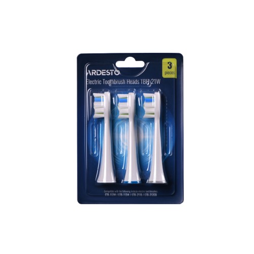 Насадка до електричних зубних щіток ARDESTO TBH-21W. У пакуванні – 3 шт. (із декоративними кільцями чорного, синього та сірого кольорів). Щетина DuPont середньої жорсткості ефективно очищує зуби за дбайливого ставлення до ротової порожнини та ясен. Індикаторні щетинки синього кольору в процесі використання змінюють колір на білий, сигналізуючи про необхідність заміни насадки на нову. Сумісна з моделями зубних щіток ARDESTO: ETB-112W, ETB-113W, ETB-211B, ETB-212СB.