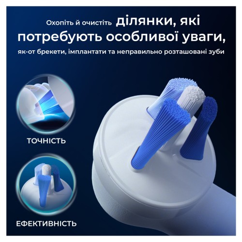 • Спеціально створена за підтримки професійних стоматологів Вона досягає й очищує найскладніші ділянки, які за звичайних умов потребують додаткової уваги, як-от брекети, імпланти та неправильне розташування зубів