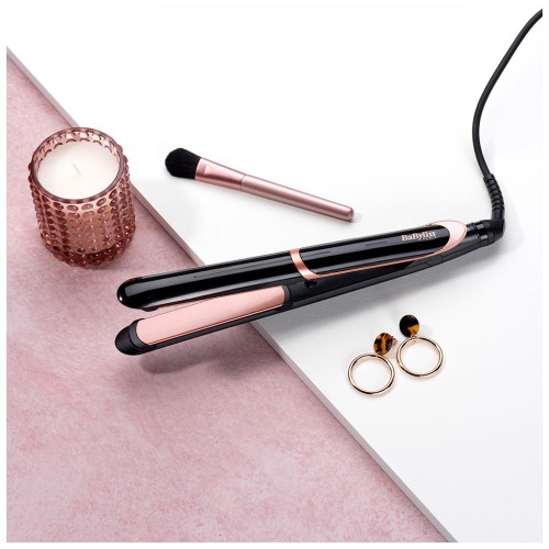 Випрямляч BaByliss ST391E має кераміко-турмалінові плавучі пластини, іонізацію та електронне регулювання температури в діапазоні 140–235 °C. Прилад нагрівається приблизно за 30 секунд, підтримує 6 температурних режимів, оснащений LED-індикацією, автовимкненням, захистом від перегріву та шарнірним шнуром довжиною 2,5 м. У комплекті є термостійкий килимок для безпечного використання й зберігання.