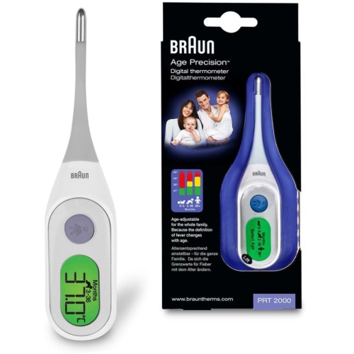 Термометр Braun PRT2000 оснащений дисплеєм з кодуванням кольорів і налаштовується з урахуванням віку. У його роботі використовуються медичні рекомендації щодо інтерпретації температурних показників, що позбавляє необхідності будувати припущення при тлумаченні показань температури у всіх членів сім'ї.