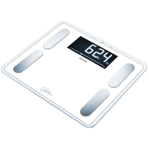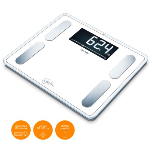Великі діагностичні ваги Beurer BF 410 зі збільшеною максимальною вагою та інтерпретацією результатів. Визначають вагу тіла, жирну масу, вміст води в організмі, м'язову масу, кісткову масу, визначають обмін речовин і рівень фізичної активності (BMR/AMR), розраховують індекс маси тіла.
