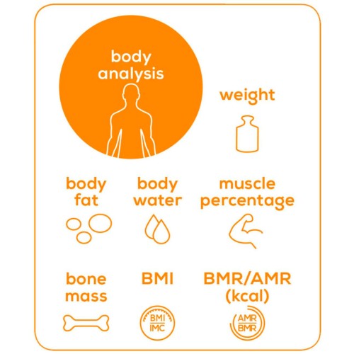 підсвітка екрану; індикатор низького заряду батарей; великий дисплей розміру xxl з підсвіткою; велика платформа з міцного скла; збільшена максимальна вага: до 200 кг; автоматичне включення / відключення; аналізатор жирової маси