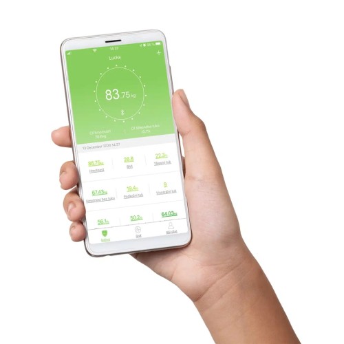 Щоб в повній мірі використовувати всі функції ваг, необхідно завантажити на свій мобільний телефон або планшет додаток Feelfit, який доступний чеською мовою і знаходиться у вільному доступі в Google play (Android) або App Store (iOS). Під час зважування на LED дисплеї ваг відображається поточне значення маси вашого тіла. Інші дані автоматично передаються через Bluetooth до мобільного додатку, який їх обробляє, оцінює та зберігає. Завдяки журналу зважувань ви можете відстежувати свій прогрес, оцінювати ефективність вправ, створювати нові цілі та переглядати свої харчові звички на основі цих даних. Додаток Feelfit також дозволяє синхронізувати дані з іншими програмами для відстеження здоров'я - Apple Health, Fitbit, Google Fit і Samsung Health.