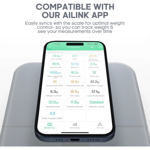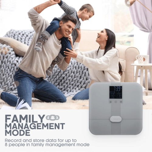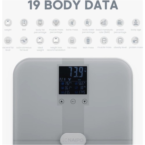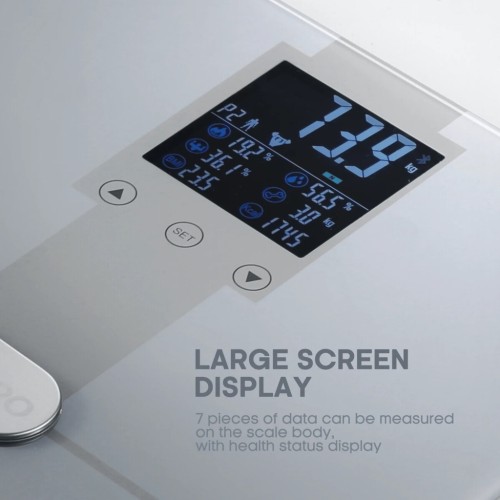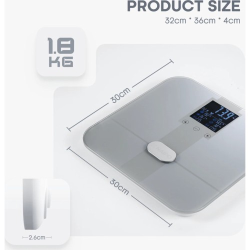 - Bluetooth APP - можливість переглядати 18 даних про тіло на телефоні (вага, ІМТ, рівень жиру в організмі, швидкість м’язів, кісткова маса, вода, рівень основного метаболізму, рівень білка, вік тіла, індекс вісцерального жиру, підшкірний жир, стандартна вага, вага контроль, жирова маса, без жирова маса, м’язова маса, рівень ожиріння, кількість білка)