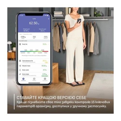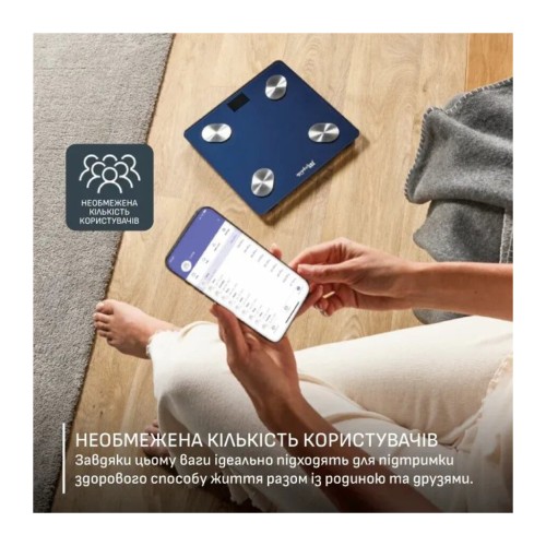 Ваги Tefal Goodvibes Life+ виконують комплексний аналіз складу тіла з відображенням результатів у мобільному застосунку. Система вимірює 15 показників, що формують цілісне уявлення про фізичний стан. Платформа зі загартованого скла поєднана з датчиками з нержавіючої сталі для стабільних і точних вимірювань. Автоматичне розпізнавання користувачів забезпечує коректне ведення статистики для кількох осіб.