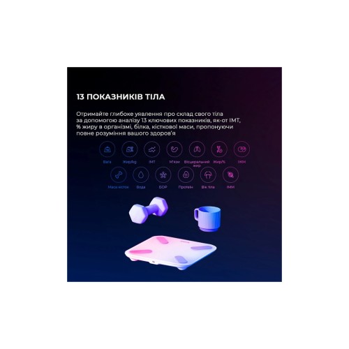 індексу маси тіла; кількість рідини; частка жирової тканини; частка кісткової маси; частка м'язової маси; біологічного віку; графік зміни ваги; оптимальної ваги