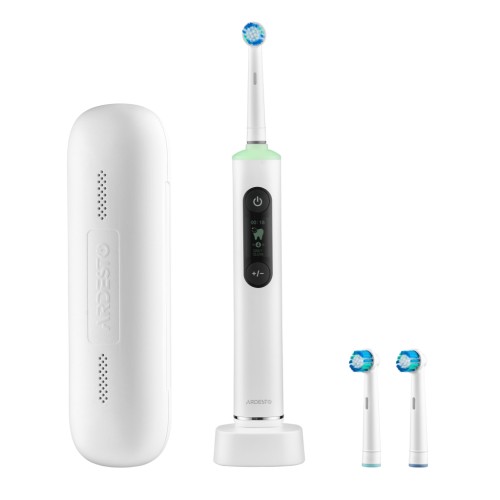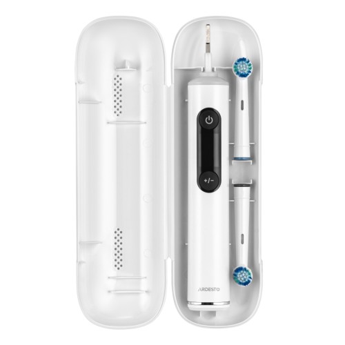 Електрична зубна щітка ARDESTO працює зі швидкістю 6 800–10 000 об./хв і підтримує п’ять режимів чищення з п’ятьма рівнями інтенсивності. Щетинки DuPont і Pedex середньої жорсткості ефективно видаляють наліт, а їх знебарвлення слугує індикатором зношування насадки. Модель оснащено LCD-дисплеєм, смарттаймером, функцією пам’яті, сенсором надмірного натискання і кольоровою світловою індикацією. Акумулятор 800 мА·год забезпечує до 90 хв автономної роботи, що еквівалентно понад трьом тижням використання (двічі на день по 2 хв). Заряджання здійснюється в бездротовий спосіб. У комплекті: три насадки, індуктивна зарядна база з USB-кабелем, захисний ковпачок і дорожній футляр.