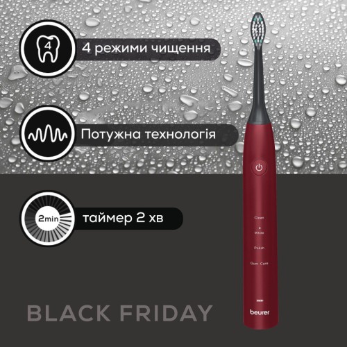 Нова сучасна звукова щітка Beurer SC 30 з лімітованої серії Black Friday 2025 у модному вишневому кольорі забезпечує бездоганну усмішки щодня. Працює за сучасною звуковою технологією з частотою до 8000 коливань за хвилину. Ефективно видаляє наліт і забезпечуює професійний рівень догляду вдома. Сучасна технологія, стильний дизайн і вигідна ціна в обмеженій серії роблять цю щітку справжнім must-have у категорії догляду за зубами.