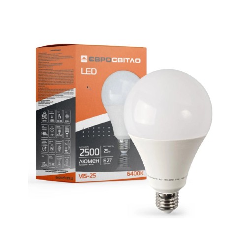 Лампу світлодіодну високопотужну Євросвітло 25Вт 6400К (VIS-25-E27) беруть для складів, заводів, промислових підприємств і вулиці. Вона дає рівномірне потужне світло і споживає в 10 разів менше електроенергії, ніж лампа розжарювання такої ж яскравості.