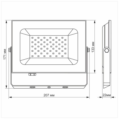 Корпус LED прожектора прекрасно протистоїть волозі, дощу, снігопадів і іншим погодних опадів. Клас захисту IP65.