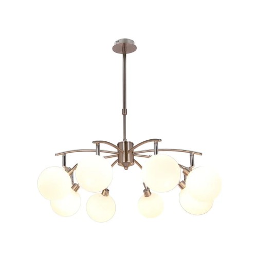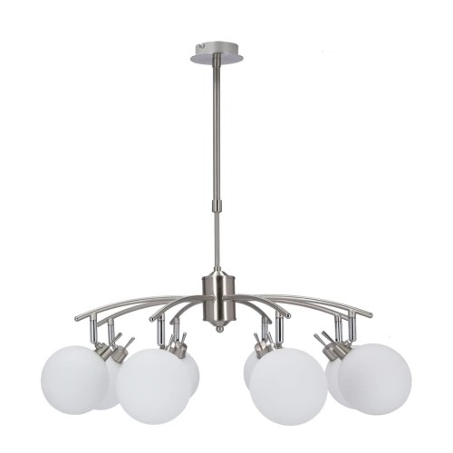 Виготовлений з високоякісного скла, плафон люстри демонструє красивий білий колір, забезпечуючи м'яке і заспокійливе сяйво для будь-якого простору. Витончена металева основа в хромованому кольорі додає нотку вишуканості та доповнює загальний сучасний стиль люстри.
