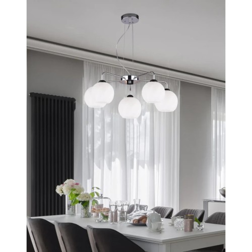 Серія LARIX пропонує унікальний погляд на традиційні люстри зі скляним абажуром та металевою основою. Білий абажур додає елегантності, а хромована основа - сучасного, вишуканого вигляду. Ширина 58 см і висота 115 см роблять його ідеальним розміром для різних приміщень, від вітальні до офісу.
