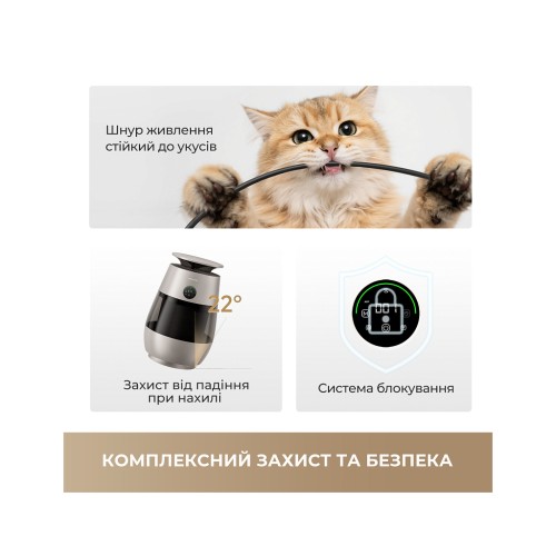 Потрійна система безпеки гарантує захист вашого улюбленця без компромісів: шнур живлення стійкий до укусів, конструкція із захистом від перекидання до 22 градусів, а також спеціальний захист для домашніх тварин.