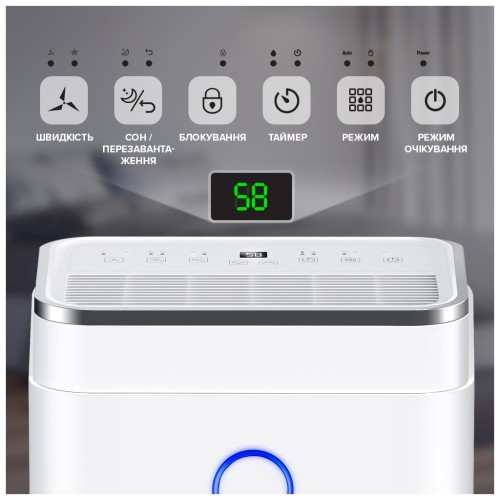 • можливість використовувати функцію сну. У цьому режимі, установка працює гранично тихо, з мінімальними обертами вентилятора та вимкненими індикаторами, але продовжує автоматично підтримувати вологість на рівні 60%.