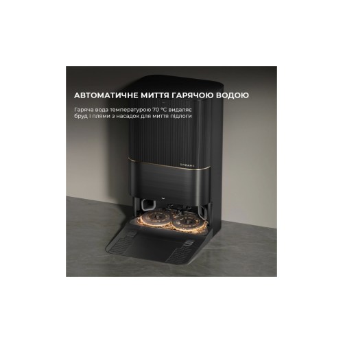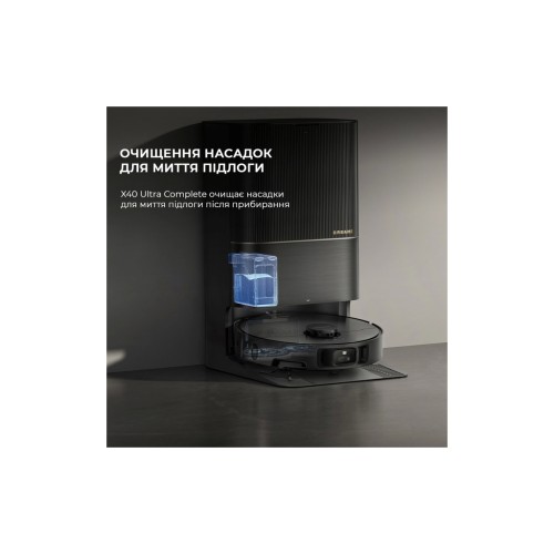 На док-станції Dreame X40 Ultra Complete Black заряджається та повністю очищується. Під час прибирання він заїжджає на неї для заряджання, витрушування пилозбірника, поповнення запасів води, мийного засобу та очищення насадок. А потім продовжує прибирання з того ж місця. Завершивши завдання, робот очищує пилозбірник, пере насадки за температури 70 °C та сушить їх гарячим повітрям.
