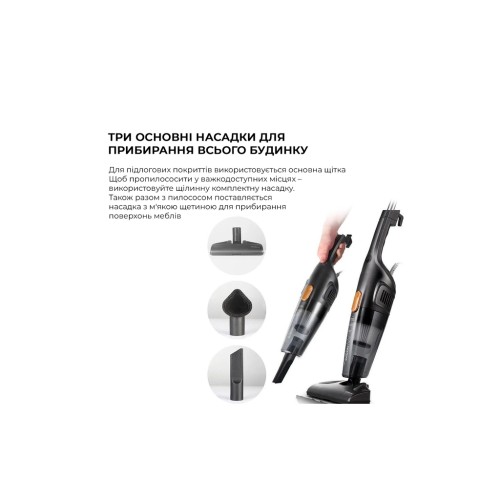 Функціональність цього пристрою доповнюється трьома насадками: для меблів, щілинна та основна. Це дозволяє виконувати глибоке очищення навіть у важкодоступних місцях, таких як щілини диванів або простір під меблями. До того ж, вертикальна парковка забезпечує зручність використання та зберігання пилососа.