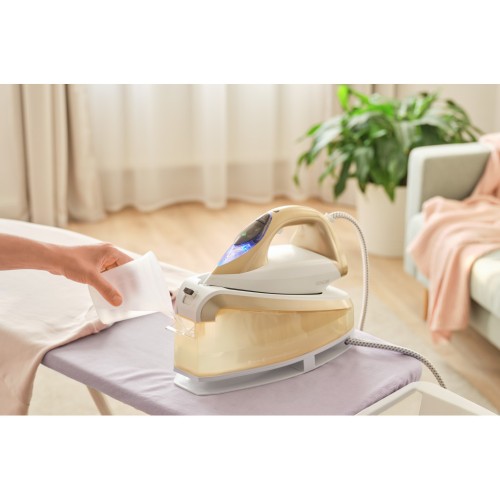 Завдяки потужності 2 400 Вт і тиску пари 5,5 бар ця домашня помічниця гарантує ідеально випрасуваний одяг. Час нагрівання 35 секунд забезпечує швидке використання. Завдяки функції вертикального відпарювання ви також можете використовувати праску для одягу, що висить безпосередньо на вішалці. Плавне регулювання температури та подачі пари.