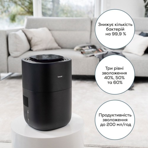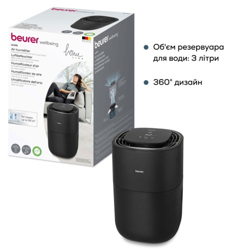 Зволожувач повітря Beurer LB 200 в актуальному дизайні оснащений автоматичним інтелектуальним режимом для постійного гігієнічного зволоження. Три рівні зволоження забезпечують вологість повітря 40%, 50% або 60%, а технологія природного холодного випаровування дозволяє знищити до 99,9% бактерій.1) Інтелектуальний автоматичний режим вимірює поточну вологість повітря та регулює потужність відповідно до бажаної вологості. Завдяки особливо тихому нічному режиму повітря у приміщенні постійно зволожується навіть у нічний час.