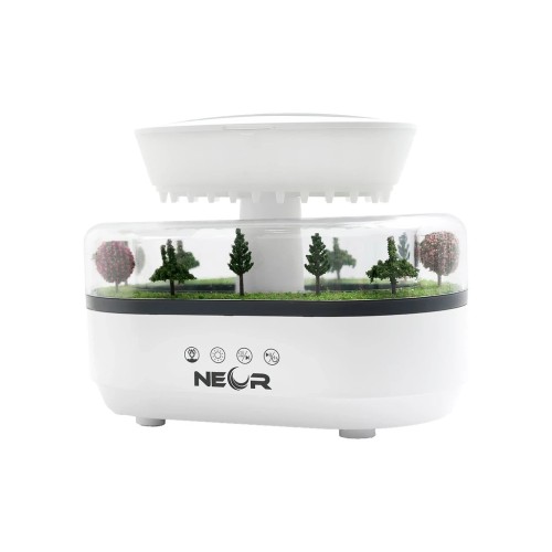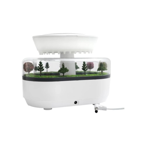 Пристрій за допомогою ультразвукової технології створює м’який прохолодний туман, ефективно зволожуючи повітря. Проте його головна магія — симуляція дощу. Краплі води повільно падають з «хмаринки» на мікроландшафт, даруючи медитативний звук і заворожуючий візуальний ефект.