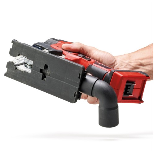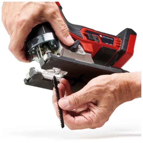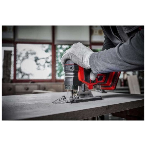 Акумуляторним лобзиком Einhell можна керувати не тільки зверху завдяки спеціальній ручці Т-подібної форми, але й над головою. Наприклад, якщо пиляння виконується під стільницею, завдяки пласкій ручці лобзик можна оптимально притиснути до плити. Взаємодія рукоятки, функції маятникового підйому та захисту від розриву стружки гарантує чистий результат без розривів.