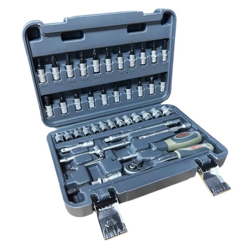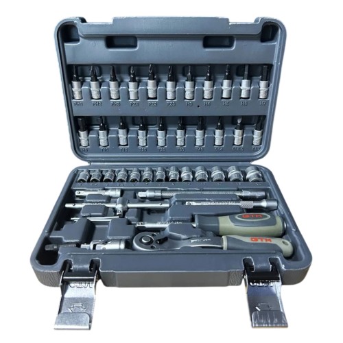 Набір інструменту - універсальне рішення для роботи з різьбовими з’єднаннями, дрібного ремонту, монтажу та сервісних робіт. Усі елементи виготовлені з високоякісної хром-ванадієвої сталі (CrV), що забезпечує підвищену міцність, стійкість до зносу та довгий термін служби. Тріскачка з механізмом на 72 зубці (72Т) гарантує точне та плавне налаштування моменту навіть у важкодоступних місцях. Двокомпонентна ергономічна рукоятка забезпечує комфорт під час роботи та запобігає ковзанню.