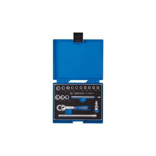 У комплекті ви знайдете 17 високоякісних інструментів, серед яких тріскачка, кардан шарнірний, Т-подібний вороток, подовжувач і торцеві головки. Все це розміщено у зручній валізі, що легко транспортується і забезпечує організоване зберігання інструментів, надаючи вам швидкий доступ до кожного елементу під час роботи.