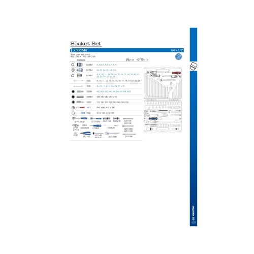 Комплектація набору включає торцеві головки з метричною розмірністю та формою робочого профілю у вигляді шестигранника та Е-профілю. Усього у наборі представлено 36 торцевих головок, які мають стандартну довжину, з розмірами від 1/4" до 1/2", що дозволяє легко підлаштуватися під різні види робіт. Унікальна система різних прієднувальних квадратів 1/4" та 1/2" робить даний комплект універсальним для роботи з різними інструментами.