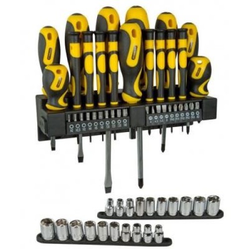 У комплект набору викруток Stanley (57шт) (STHT0-62143) входять викрутки з різними типами наконечників, викрутковий тримач, набір викруткових вставок з різними типами шліців, адаптер для торцевих головок і комплект торцевих головок.