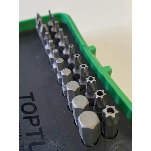 Комплект збагачено 31 бітом різних типів, що включають: квадратний (SQ), хрестоподібний (PH), хрестоподібний з насічками (PZ), Security Torx (TR), шестигранний (Hex, H), зірочка (Torx) та плоский (SL). Таке різноманіття дозволяє стикатися з будь-якими з'єднаннями, гарантуючи вирішення навіть найскладніших задач. Розміри біт варіюються від SQ1 до SL8 і забезпечують високу адаптивність до різних умов. Бітові насадки мають довжину 25 мм, що дозволяє зручно працювати в обмежених просторах.