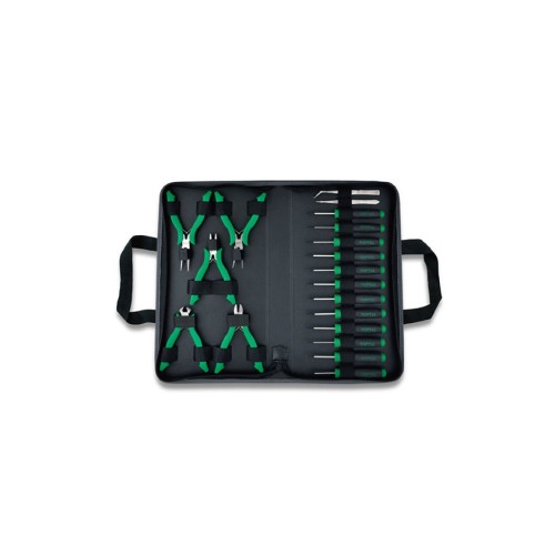 У складі набору є 19 ретельно підібраних інструментів, включаючи пінцети, кусачки, плоскогубці, бокорізи та довгогубці, які допоможуть впоратись з будь-якими механічними задачами. Особливу роль у наборі грають 12 високоякісних прецизійних викруток, що були спеціально розроблені для точних робіт. Різноманітність шліців, серед яких плоский (SL), зіркоподібний (Torx / T) та хрестоподібний (Phillips / PH), забезпечують чудову універсальність використання в різнинних ситуаціях. До набору також входять унікальні розміри викруток, такі як PH000 x 50 мм, T8 x 50 мм, SL1.5 х 50 мм і багато інші, які роблять набір незамінним для будь-яких дрібних ремонтних справ.