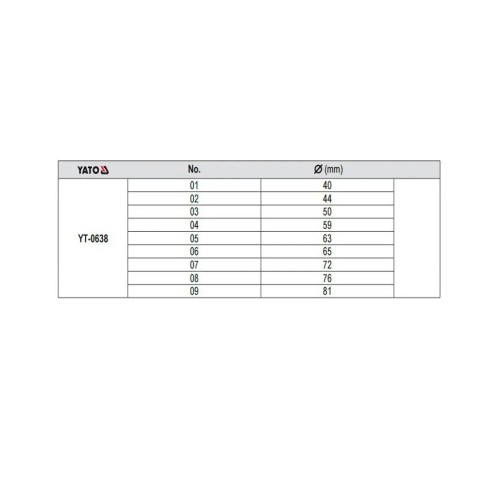 Набір інструментів Yato YT-0638 призначений для професійного використання в автомобільному сервісі та машинобудуванні. До комплекту входять 10 елементів, серед яких 9 оправок з діаметрами від 40 до 81 мм, ідеальних для встановлення та демонтажу підшипників і сальників. Оправки оснащені плоскою поверхнею, що забезпечує рівномірну правку без перекосів.