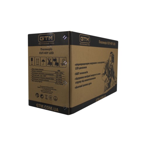 GTM CUT-40Y LED - інверторна установка для повітряно-плазмового різання різних конструкційних матеріалів: сталь, мідь, алюміній, чавун і т.д. Апарат для плазмового різання CUT-40Y LED генерує плазму за допомогою повітря, що проходить через спеціальний блок підготовки. Температура в місці різу досягає 15000 С, що дозволяє з легкістю різати найтвердіші метали.