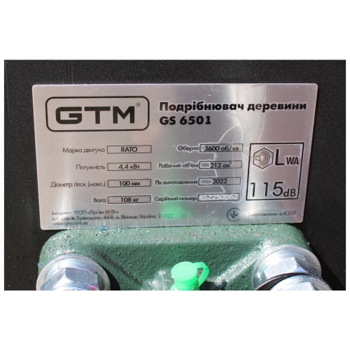 GTM GS6501 - високоефективний побутовий подрібнювач гілок, призначений для роботи зі свіжою та сухою деревиною. Ножі в рух наводить бензиновий двигун Rato з потужністю 6,5 л. Ріжучий барабан діє як додаткова система втягування гілок, завдяки чому швидкість подрібнення сягає 10 м/хв. Максимальна товщина свіжих гілок під час роботи становить 100 мм. Різальні ножі двосторонні, завдяки чому значно збільшується термін служби. Подрібнювач комплектується колесами для транспортування.