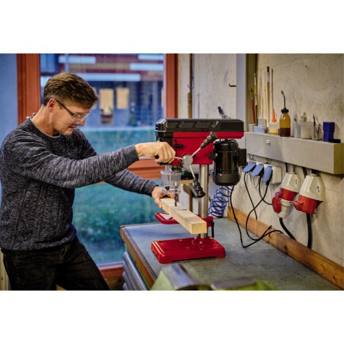 Шпиндель свердла з кульковими підшипниками забезпечує тривале та просте використання. У комплект поставки входить свердлильний стіл, що нескінченно регулюється по висоті. Також можливе обертання та нахил свердлильного столу. Для застосування тиску при свердлінні на заготівлю верстат оснащений трирукавною ручкою.
