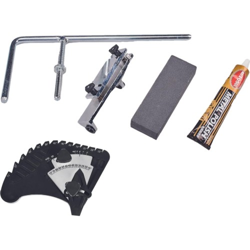 До комплекту входять брусок для регулювання зернистості шліфувального круга, зачисна паста для полірування шкіряного круга та кутомір.