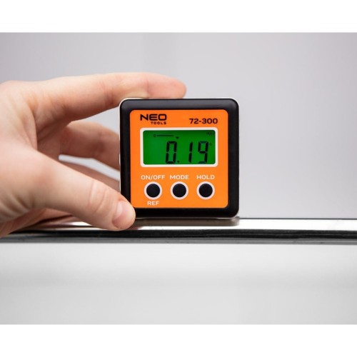 Цифровий кутомір NRO (арт. 72-300) з цифровою роздільною здатністю вимірювання: ±0,01° призначений для точних кутових вимірювань. Він має дві функції: REF (обнулення вимірювання до еталонного значення) і HOLD (заморожування показань).