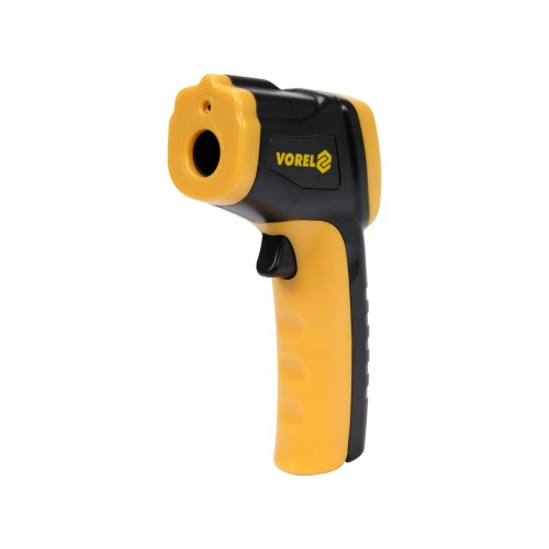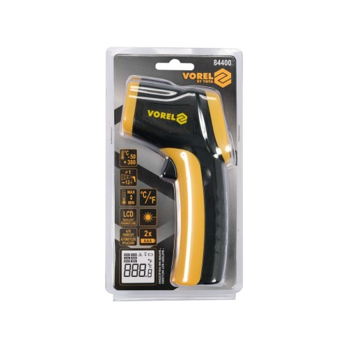 Безконтактний термометр VOREL з артикулом 84400 для інфрачервоного випромінювання з РК-дисплеєм з підсвічуванням, лазерним прицілом та з функціями, що полегшують роботу, серед іншого макс/хв та функція калібрування. Він знайде своє застосування в багатьох галузях, у т.ч. в будівництві, автомобілебудуванні, гастрономії, харчовій промисловості та побуті.