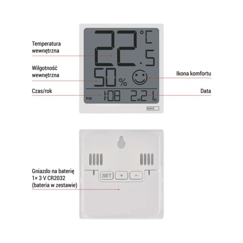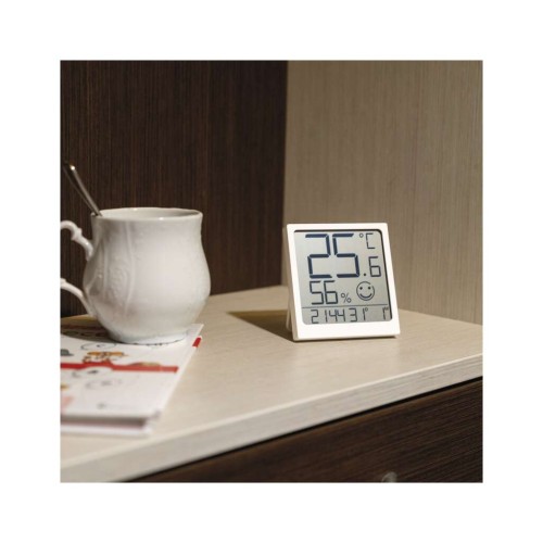 Прилад підтримує відображення температури у °C та °F. Вбудовані функції, такі як індикатор рівня комфорту, календар та годинник, забезпечують додаткову зручність використання. Корпус виготовлений із міцного пластику, а живлення здійснюється від батарейки 1×3 В CR2032, яка входить у комплект. Прилад оснащений точним кварцовим годинниковим механізмом. Білий колір додає естетики та дозволяє гармонійно інтегрувати прилад у будь-який інтер'єр.