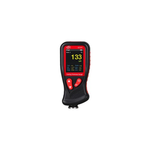 Товщиномір лакофарбових покриттів GT231 - це нова модель виробництва компанії Benetech. Цей вимірний прилад призначений для визначення товщини покриття на поверхні металевих поверхонь нерозриваючим способом. До того ж толщиномер GT231 може вимірювати товщину покриття як на магнітних (Fe) металевих поверхнях, так і на неагінних (nFe) металевих поверхнях. Достатньо притиснути товщину до дослідної поверхні і автоматично визначити тип підложки (магнітна/неагінна) і відобразити товщину покриття у діапазоні від 0 до 1800 мікрон. У той же час, щоб визначити точність приладу, потрібно п’яти мікронів. Всі вимірні значення виводяться на графічному екрані кольорів. Окрім поточного значення на екрані, буде показано найменшу, максимальну і середню товщину. Крім того, є можливість вивести на екран зміни товщини поверхні, яку ми досліджуємо.