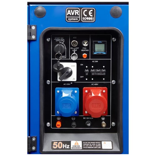 автоматичний регулятор напруги (AVR); індикатор напруги; лічильник мотогодин; мідна обмотка; індикатор рівня мастила; захист від низького рівня масла; інформаційний дисплей; захист від короткого замикання; колеса для транспортування