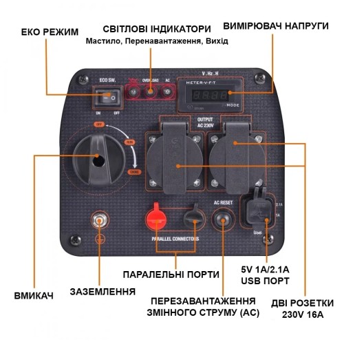 індикатор напруги; мідна обмотка; індикатор рівня мастила; захист від низького рівня масла; інформаційний дисплей; режим економії пального; індикатор навантаження