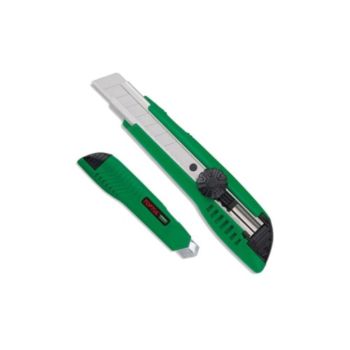 Ніж з гвинтовим фіксатором TOPTUL SCAD1817 універсальний з 2-ма запасними лезами. Використовується для розрізання картону, паперу, поліетилену, розкривання упаковок. Оснащений відламуються фиксирующимся гвинтовим держателем лезо з вуглецевої інструментальної сталі і направляючої з легованої стали. Ергономічна рукоятка підвищує ефективність і зручність роботи.
