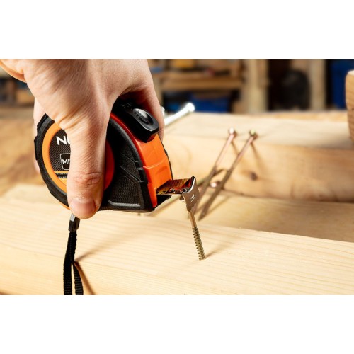 Рулетка сталева 5 м х 25 мм, автоматичний стопор, дві кнопки зупинки 67-223 від NEO TOOLS - це інструмент з довжиною 5 м і шириною 25 мм. Оснащена практичною функцією автоматичної зупинки, яка запобігає самостійному втягуванню рулетки в розгорнутому стані, а також можливістю використання двох кнопок фіксації.