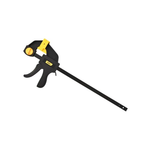 Міцна та зручна — швидкозатискна струбцина 30 см (63 × 300 мм) забезпечує силу затиску до 90 Н. Триггерний механізм із гумовими губками гарантує надійне утримання та легке використання. Упакована з етикеткою — практичний інструмент для столярних робіт, монтажу та DIY-проєктів.