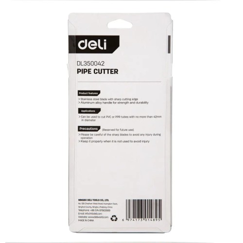 Deli EDL350042 Труборіз для пластикових труб 42 мм — зручний і надійний інструмент для швидкого різання пластикових та м’яких металевих труб. Виготовлений з легкого, але міцного алюмінієвого сплаву, що забезпечує тривалий термін служби. Завдяки висувному механізму труборіз легко адаптується до труб різного діаметра, забезпечуючи точний і рівний зріз без зусиль.